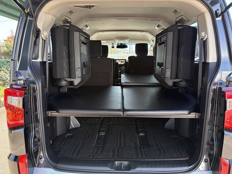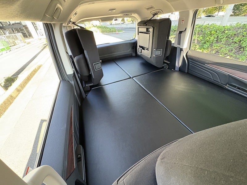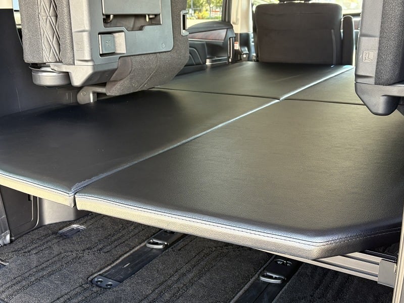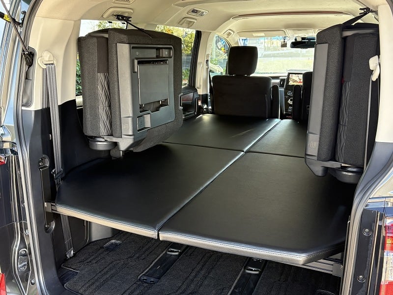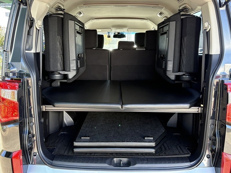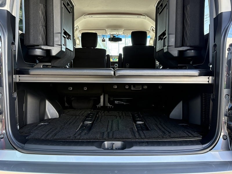 使い勝手は変わらず、ベッド下の収納もバッチリです。天板は4枚とし、セカンドシートを起こした状態で最後尾に重ねて置けますので、4人もしくは5人乗車でも邪魔になりません。