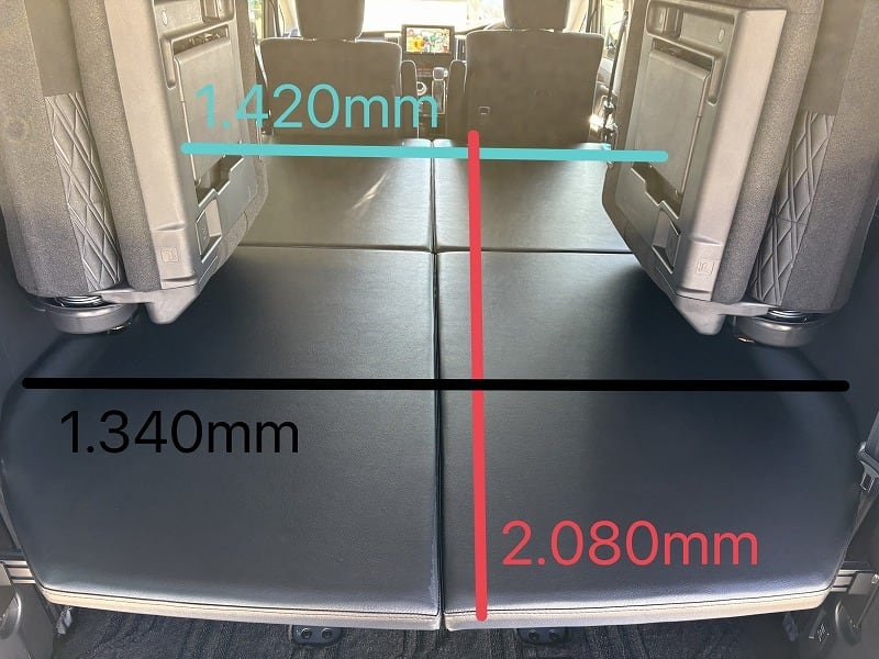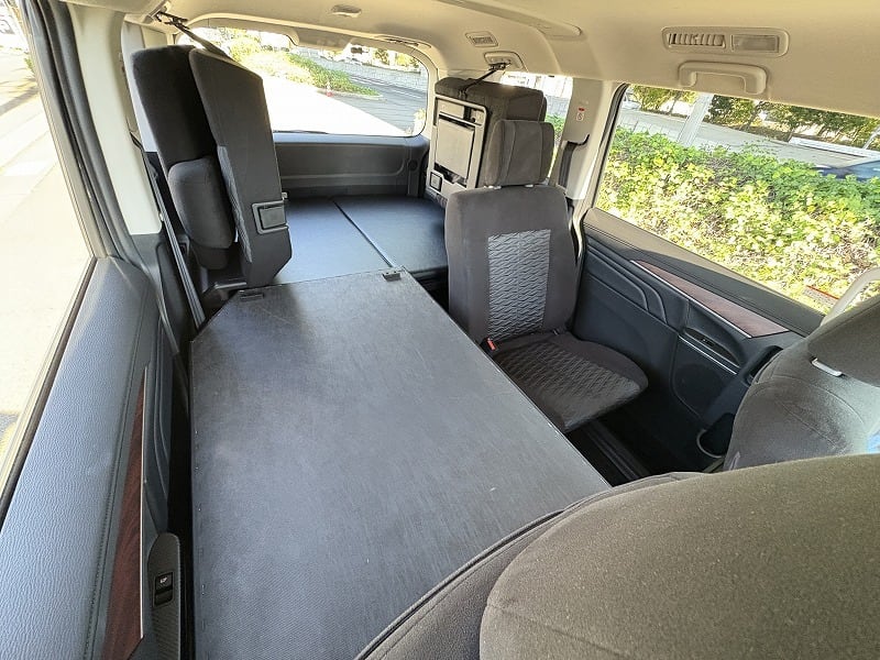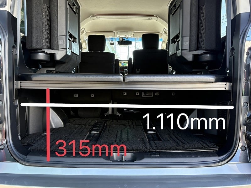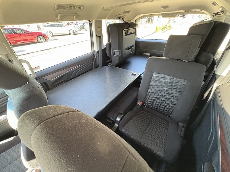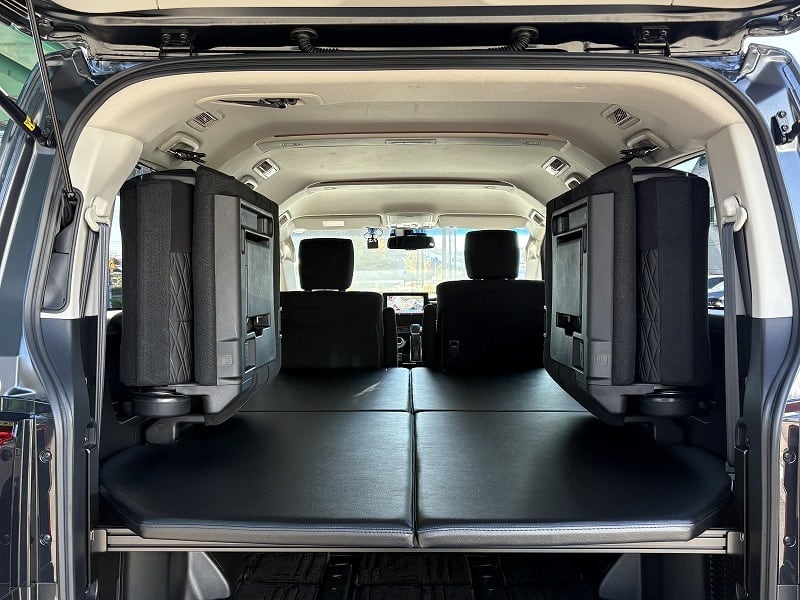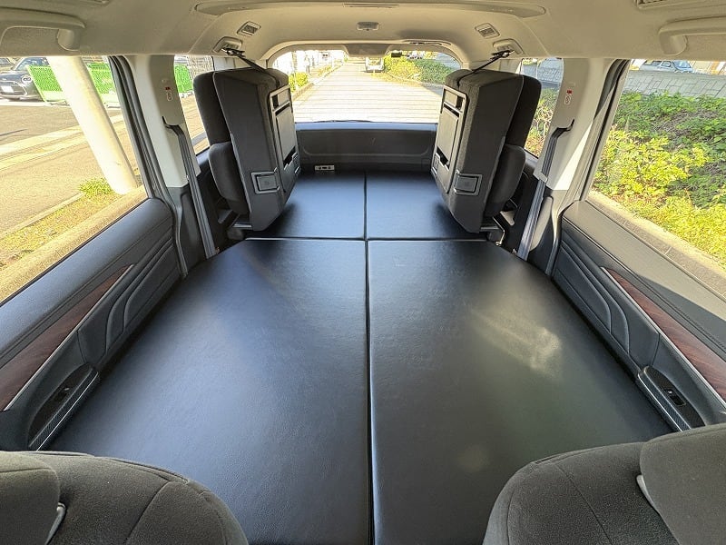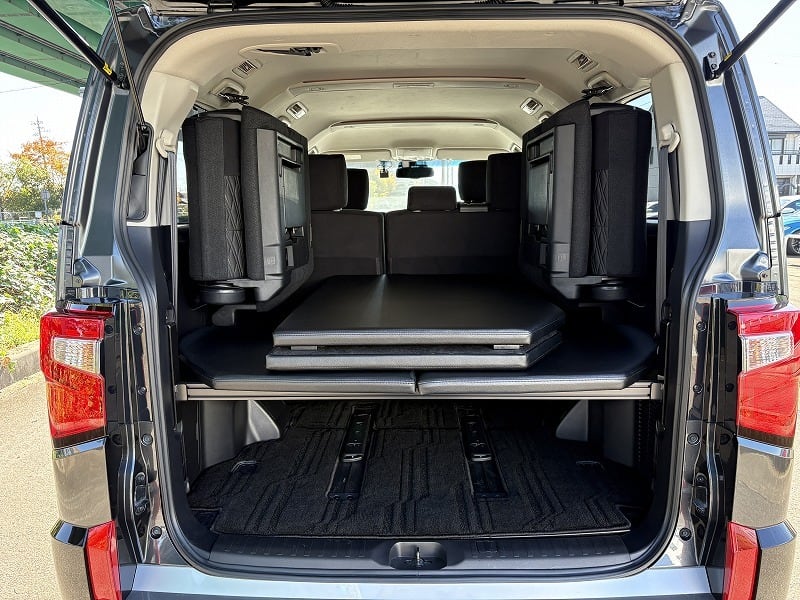 使い勝手は変わらず、ベッド下の収納もバッチリです。天板は4枚とし、セカンドシートを起こした状態で最後尾に重ねて置けますので、4人もしくは5人乗車でも邪魔になりません。