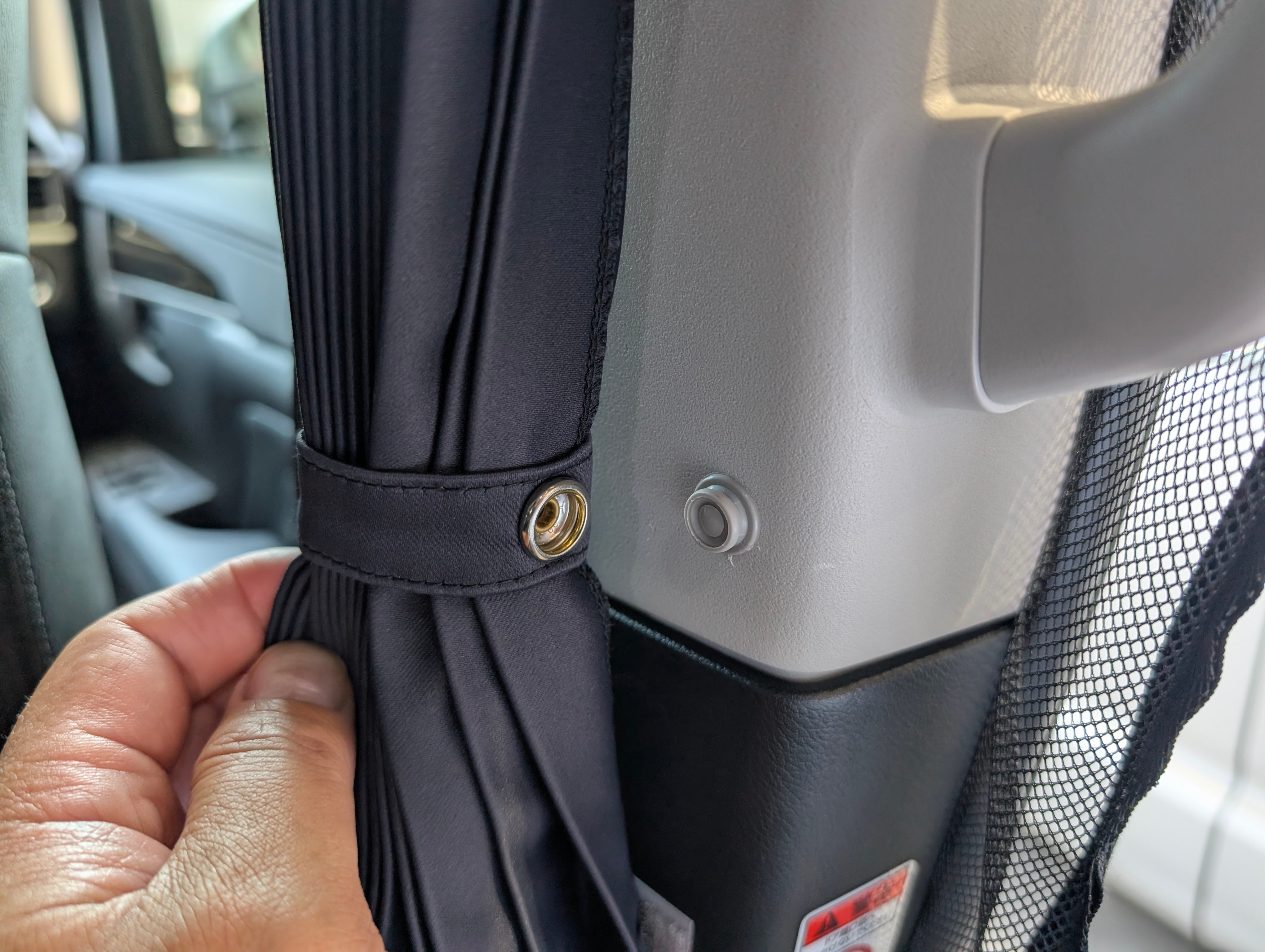 デリカD:5用遮光パーテーションカーテンです。車中泊をより快適に過ごせる様運転席後ろ側に取付するカーテンとなります。カーテンはプリーツ形状となっておりしっかりと遮光できまた使わない時はしっかりと左右に固定出来ます。