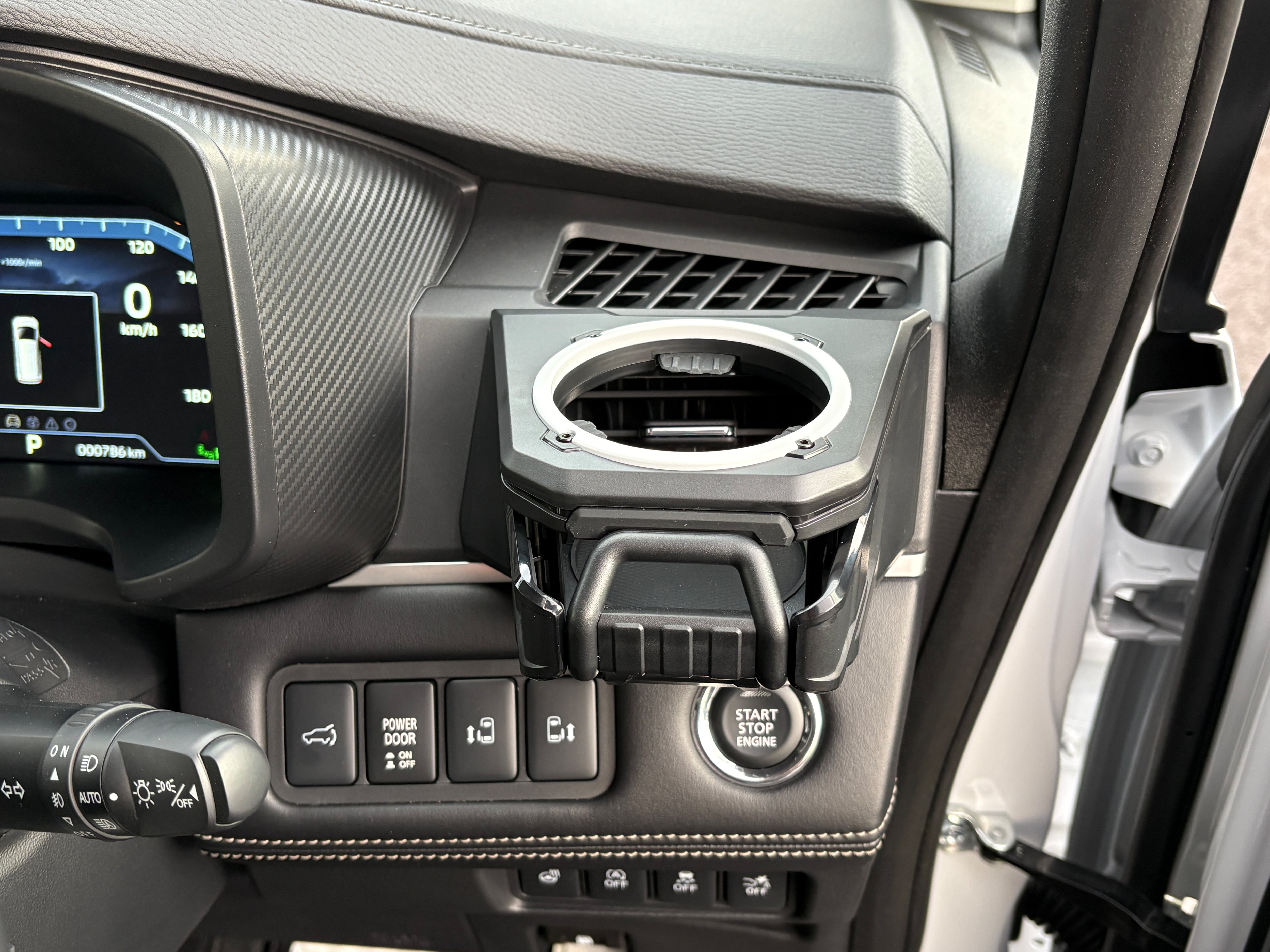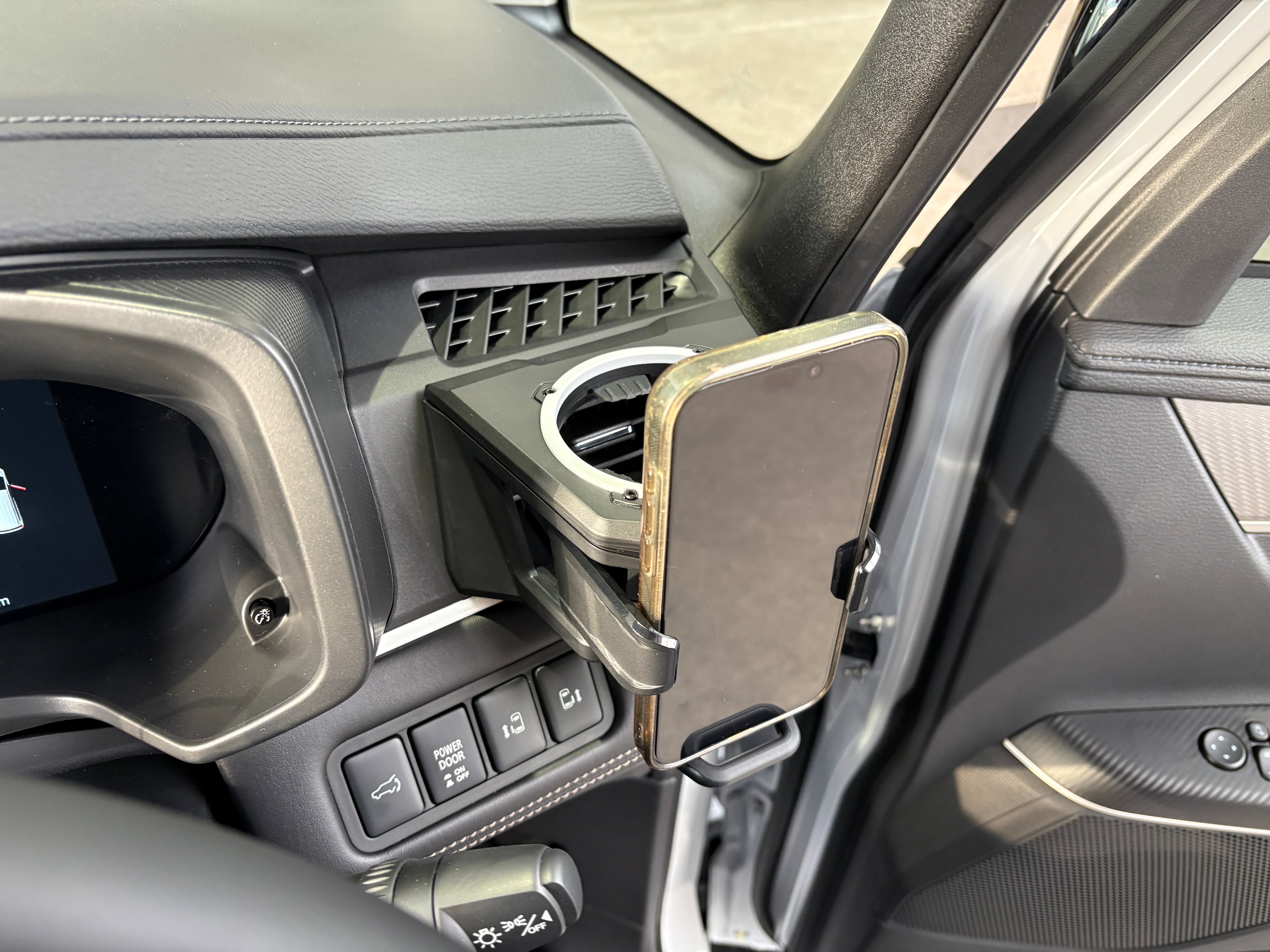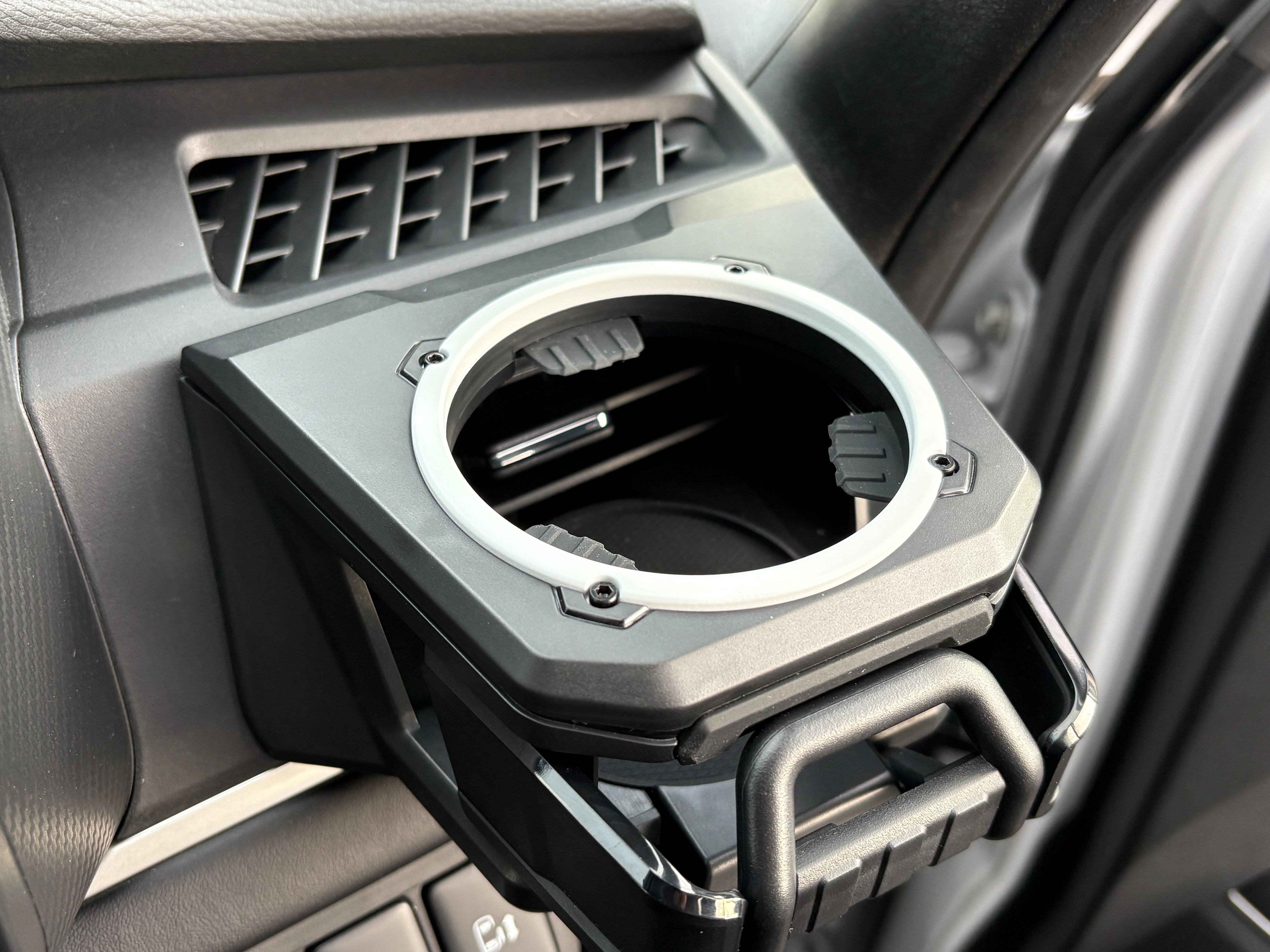 デリカD:5(2019年以降中後期型に適応)専用のドリンクホルダー(携帯ホルダー付き)です。吹き出し口にジャストフィットし違和感なく取り付けが可能。表面のリングがフロストホワイトにペイントしてあります。