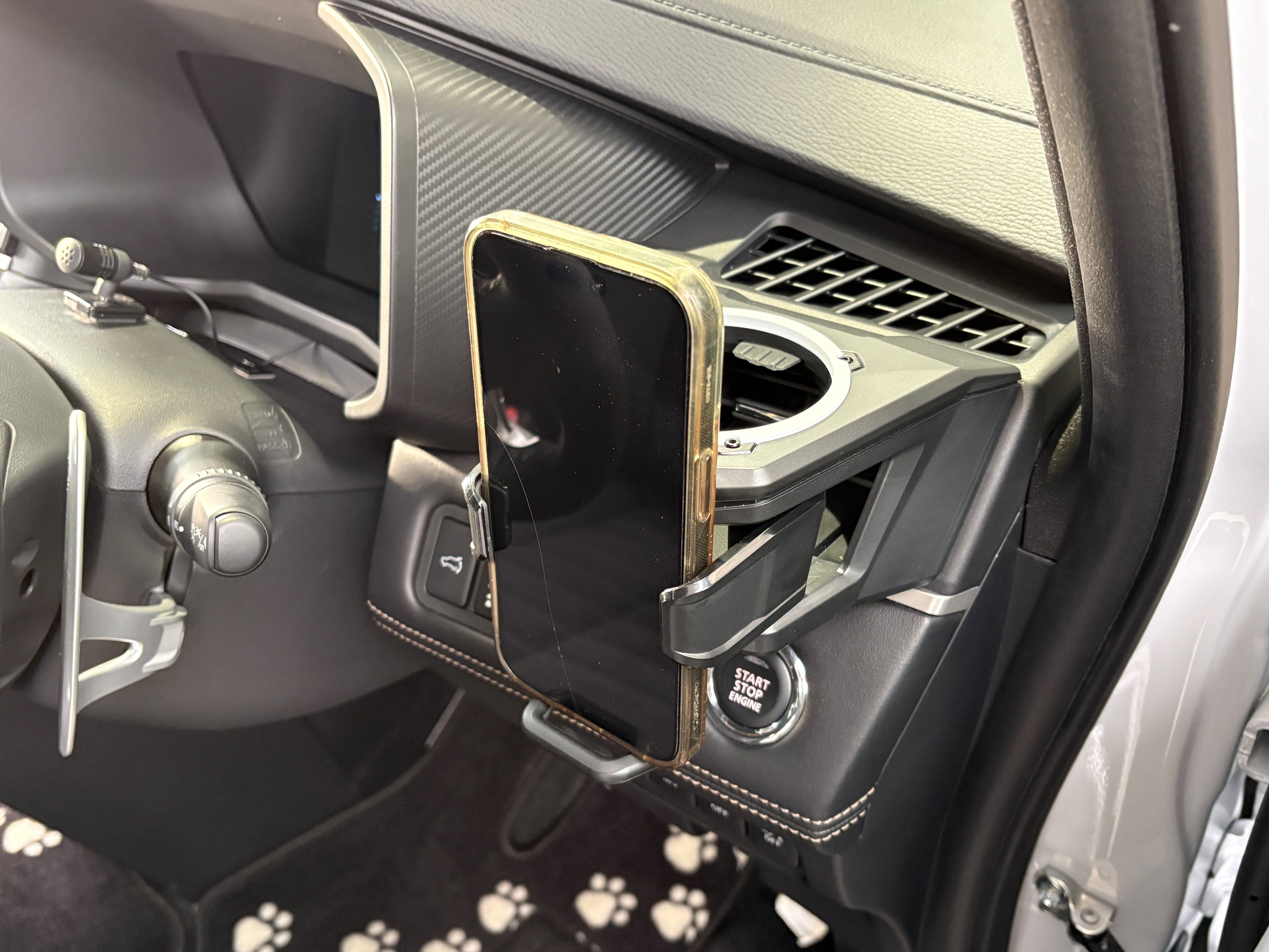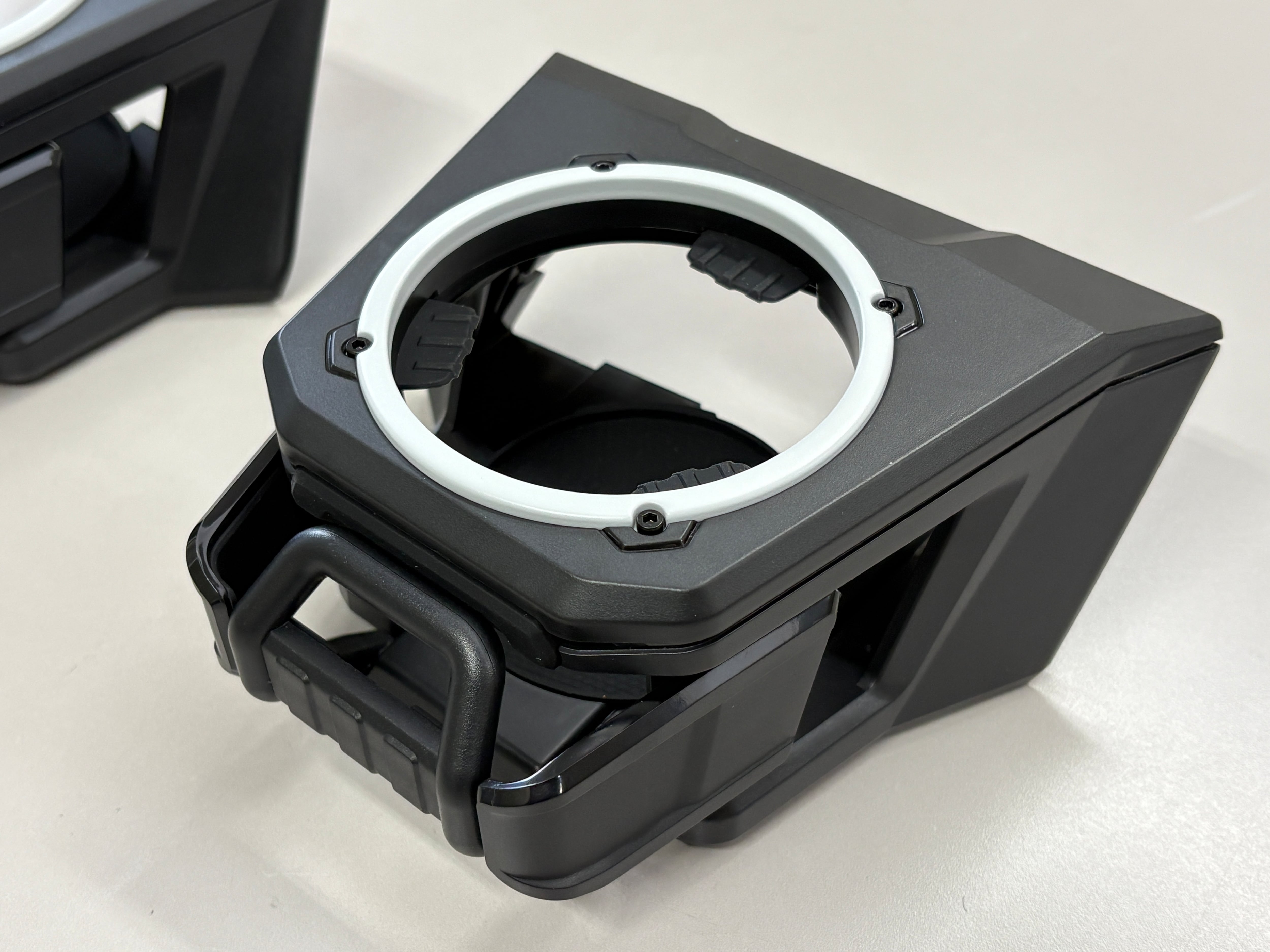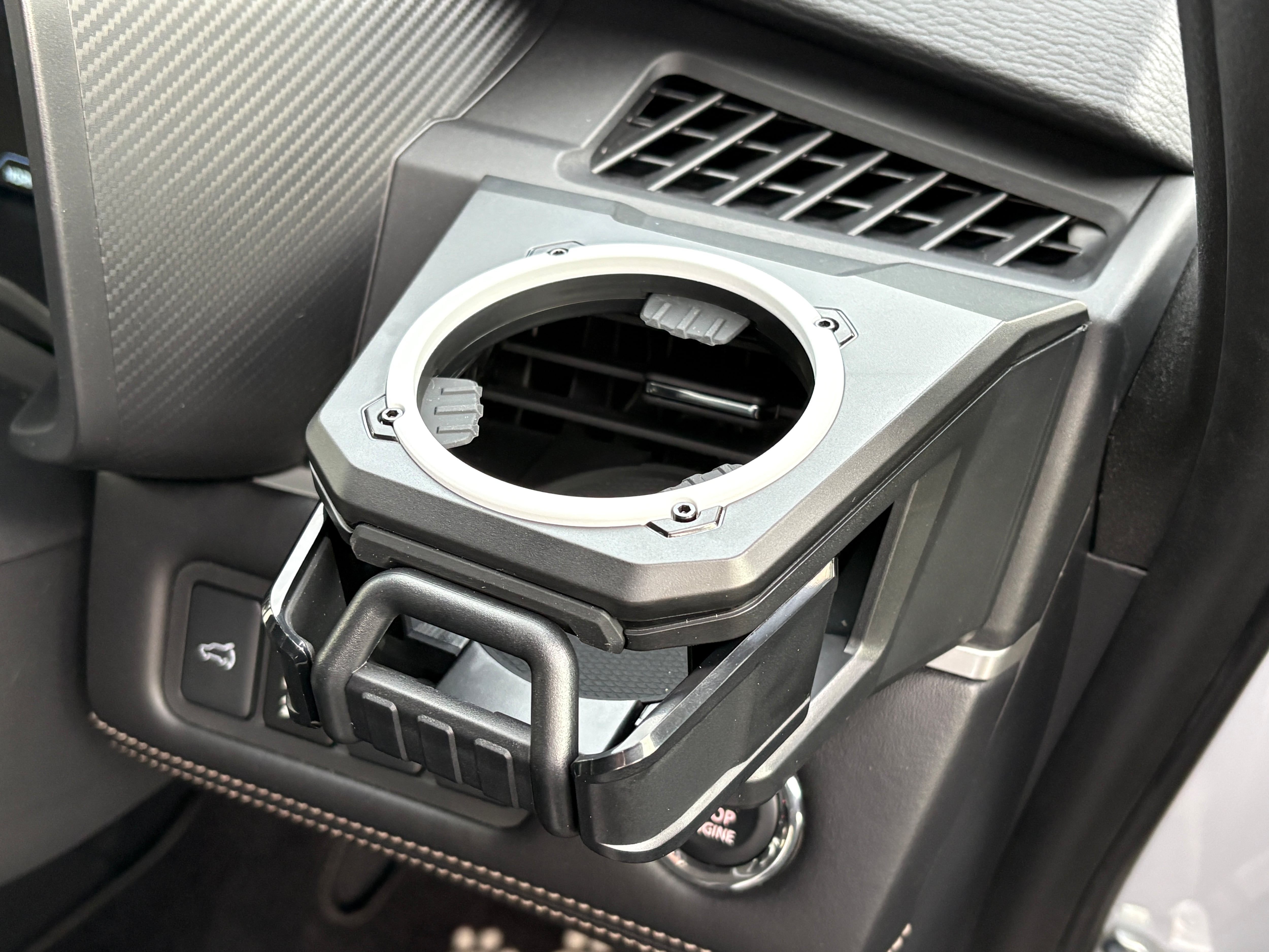 デリカD:5(2019年以降中後期型に適応)専用のドリンクホルダー(携帯ホルダー付き)です。吹き出し口にジャストフィットし違和感なく取り付けが可能。表面のリングがフロストホワイトにペイントしてあります。