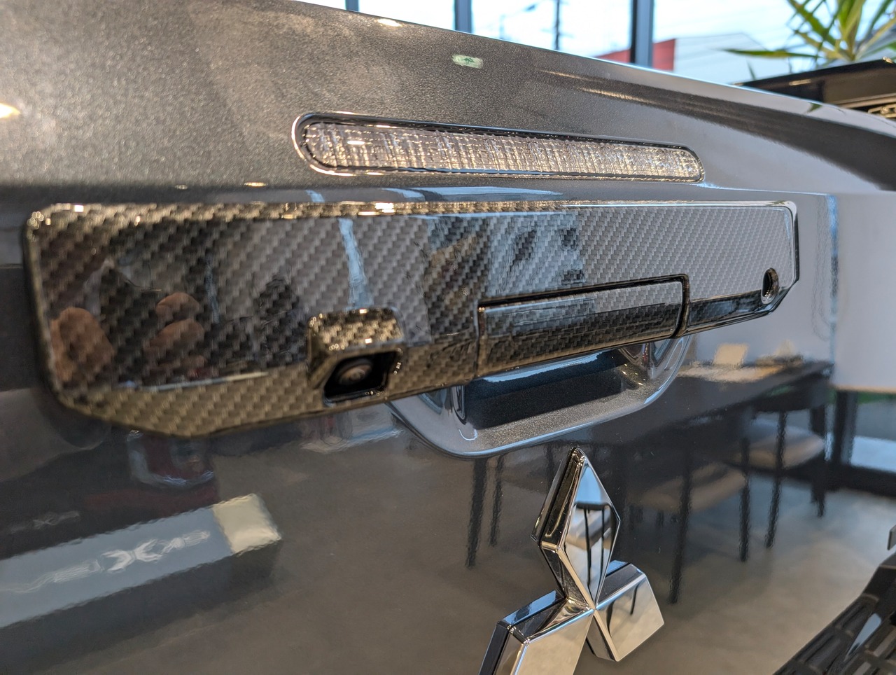 テールゲートハンドルのプロテクター(カバー)です。ノーマルの状態はクロームメッキやグロスブラックのハンドルが装備されていますがその部分をカーボン調のパネルでカバーする商品です。(取付は両面テープにて簡単に装着できます。)