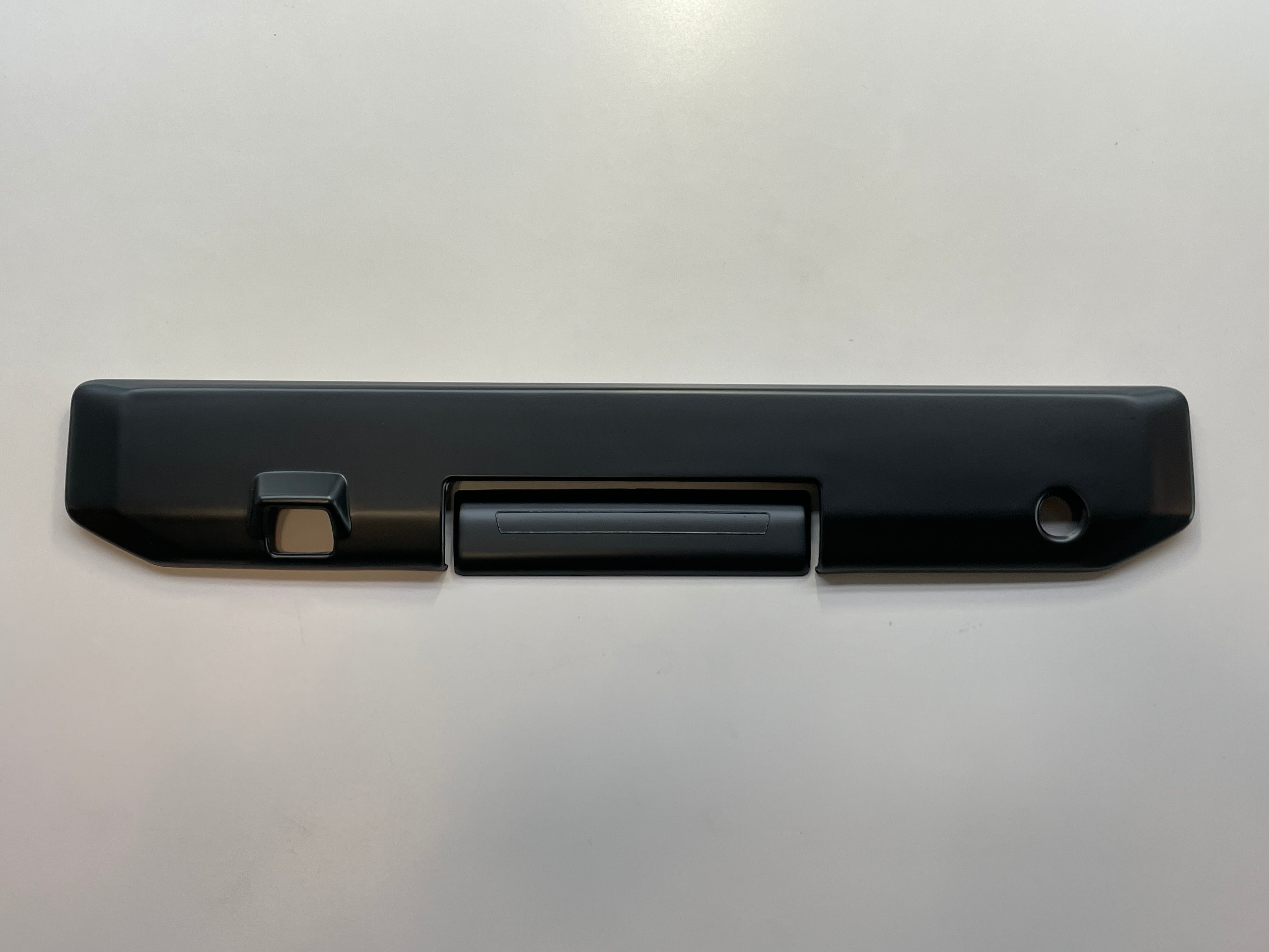テールゲートハンドルのプロテクター(カバー)です。ノーマルの状態はクロームメッキやグロスブラックのハンドルが装備されていますがその部分をマットブラックのパネルでカバーする商品です。(取付は両面テープにて簡単に装着できます。)